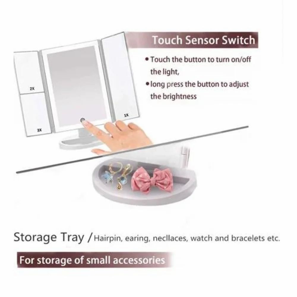Rechargeable Makeup Vanity Mirror | Tri-fold Makeup Mirror with Lights | Lighted Makeup Mirror with Magnification | Portable LED Travel Vanity Mirror with 3 Light Modes and Adjustable Brightness | Makeup Mirror | Makeup Mirror With Led Lights | Portable High Definition Cosmetic Mirror